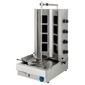 Επιτραπέζιος, ανοξείδωτος. Με το μοτέρ στο κάτω μέρος της συσκευής για την περιστροφή της ανοξείδωτης σούβλας. Μετακινούμενη ψηστική επιφάνεια του γύρου προς την σούβλα. Με συρτάρι για την περισυλλογή του λίπους. Ξεχωριστό θερμοστάτη για κάθε καυστήρα. Διαθέτει 4 εστίες.