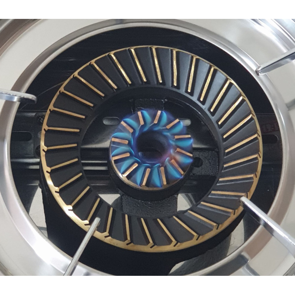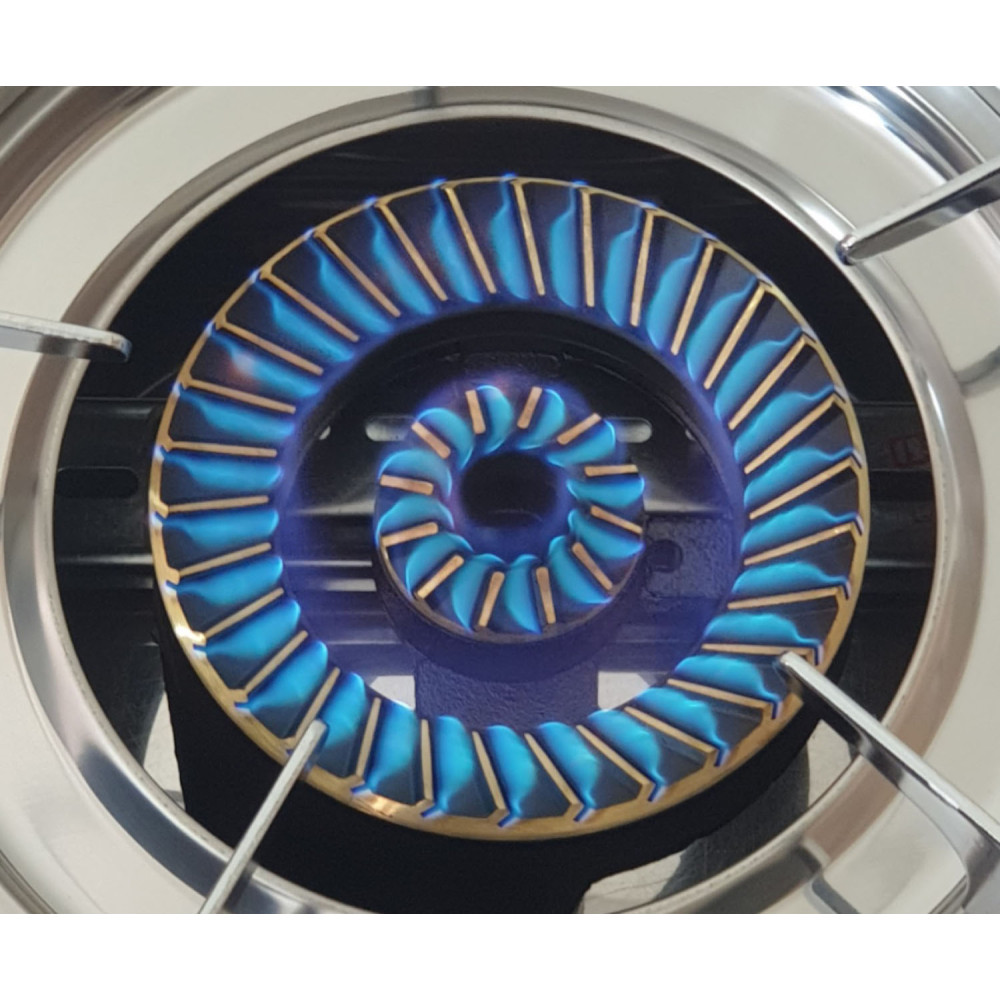 Η συσκευή λειτουργεί με ρυθμιστή χαμηλής πιέσεως. Η νέα τεχνολογία μαντεμένιου καυστήρα δημιουργεί μία εστία με ελάχιστες απώλειες ,πολύ ανθεκτικό και με πολύ μεγάλη θερμική απόδοση. Το κάθε μάτι έχει διπλή λειτουργία, δίνοντας τη δυνατότητα απομόνωσης του μικρού καυστήρα, ως αποτέλεσμα το κάνει κατάλληλο για τη χρήση μικρών σκευών όπως μπρίκι καφέ. Ο σχεδιασμός του με γυαλί το καθιστά ευπροσάρμοστο σε κάθε περιβάλλον. Παράλληλα η δομή του είναι στιβαρή και ανθεκτική, καθιστώντας την ιδανική τόσο για οικιακή όσο και επαγγελματική χρήση.